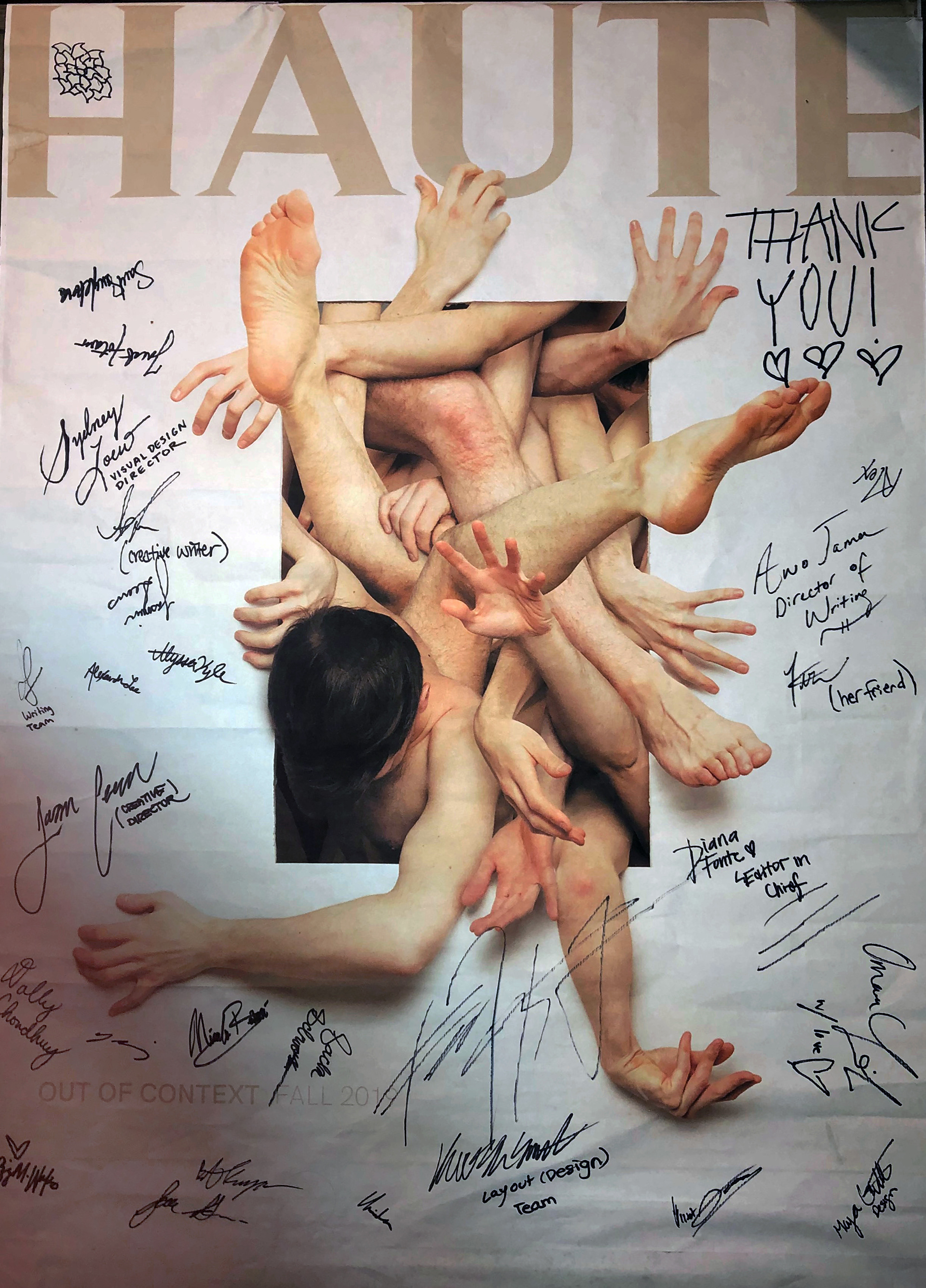 Poster featuring the signatures of some contributors to Haute's inaugural issue, Out of Context.